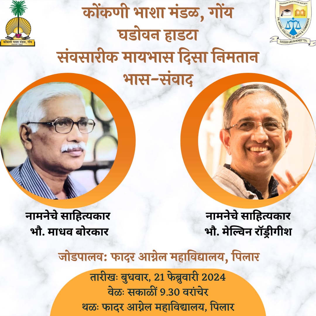 अंदूं हे कार्यावळींत मंडळ नामनेचे साहित्यकार माधव बोरकार आनी मेल्विन रॉड्रिगीश हांचे कडेन भास-संवाद घडोवन हाडटात. ही कार्यावळ 21 फेब्रुवारीक सकाळीं 9.30 वरांचेर फादर आग्नेल महाविद्यालय, पिलार हांगा जातली. कार्यावळीक महाविद्यालयाचो मोलादीक हातभार लागला. हे कार्यावळींत ह्या नामनेच्या साहित्यकारांक प्रस्न विचारपाची संद उपस्थितांक मेळटली.